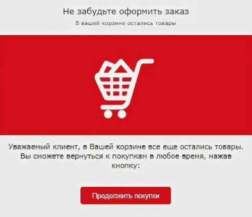 Напоминайте о забытых товарах и отправляйте уведомление о брошенных корзинах через email. Например, через час после добавления товаров в корзину, напомните пользователю о них, и дайте возможность вернуться на сайт.